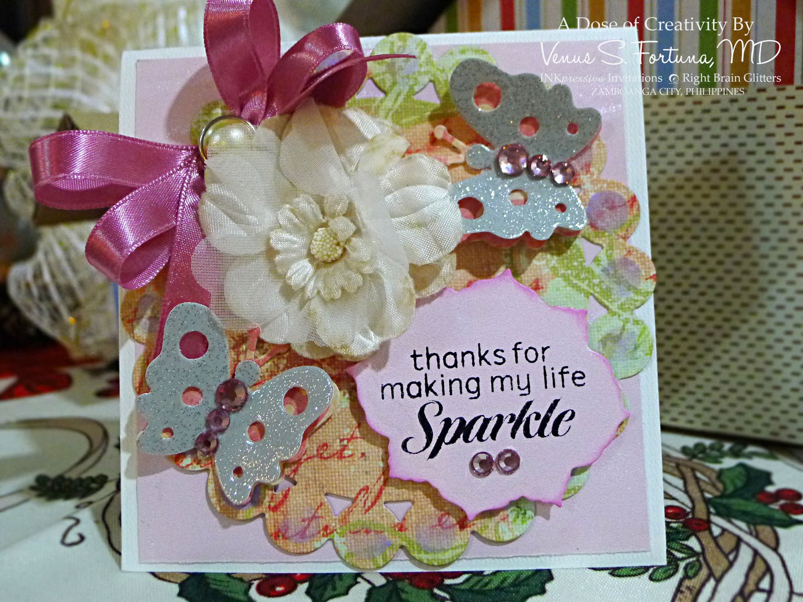 First Card with Butterflies was posted on November 25, 2011. This was also the time I bought the Cuttlebug Quick Kutz butterfly dies. Back then, my original blog name was Right Brain Glitters, as you can see on the watermark of my photo. I like this card and I mailed it to my sister.